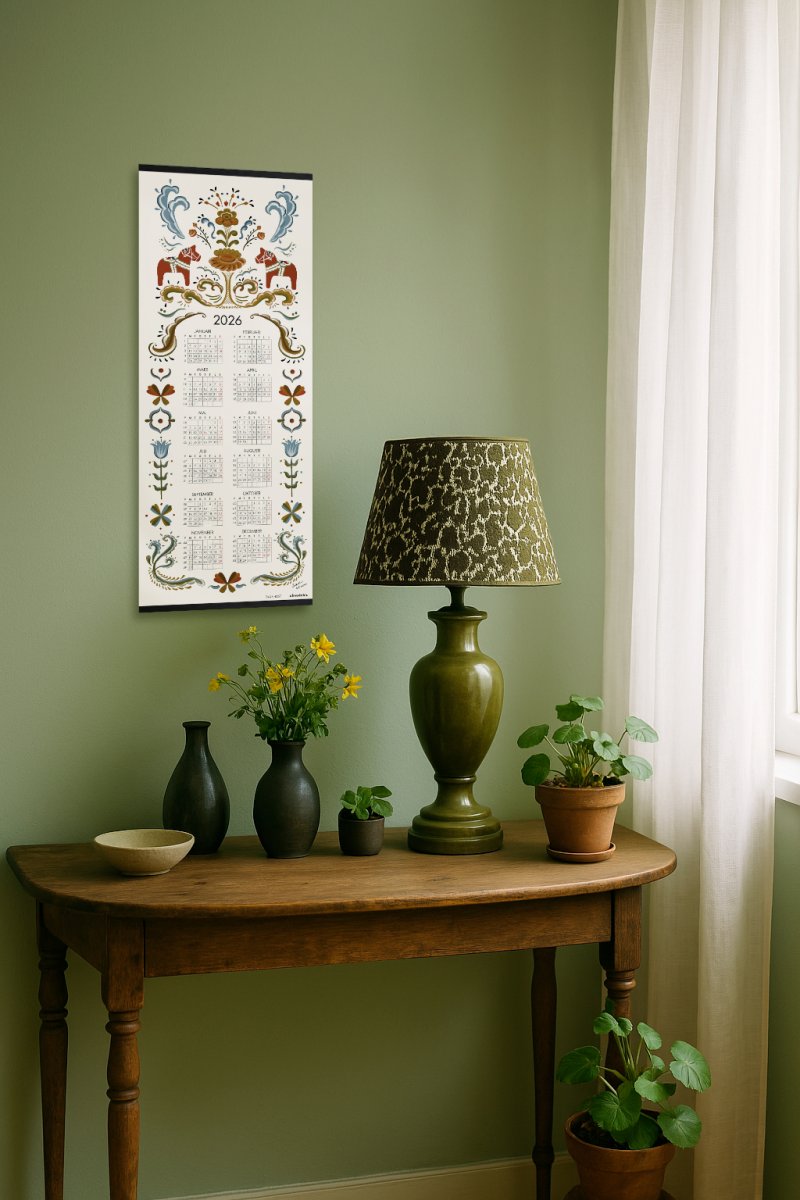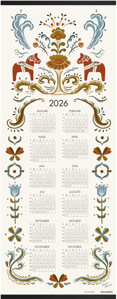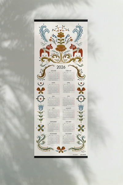 Almedahls klassiska tygkalender uppskattas av många. Inger Åbergs har designat landskapsblommor. Kalendern är avsedd för upphängning på vägg. Det printade tyget är monterat på målade trälister med nitad infästning.