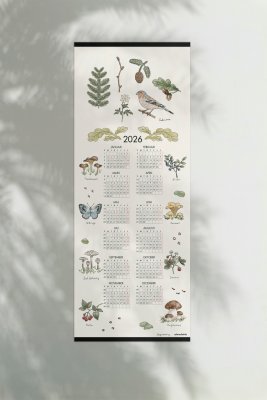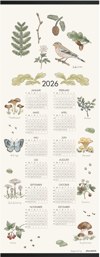 Almedahls klassiska tygkalender uppskattas av många. Kalendern är avsedd för upphängning på vägg. Det printade tyget är monterat på målade trälister med nitad infästning.